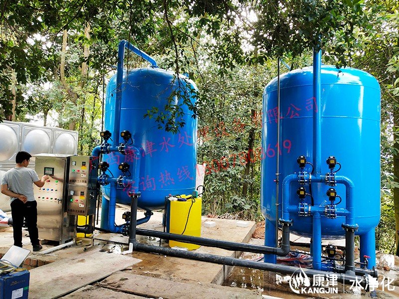 工藝流程:湖水-水箱曝氣消毒-絮凝加藥-石英砂過濾器-活性炭過濾器-精密過濾器-二氧化氯加藥器-凈水池-各用水點